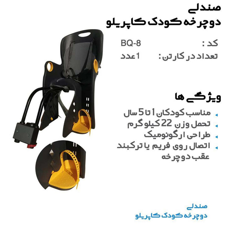 صندلی دوچرخه کودک کاپریولو مدل CAPRIOLO BQ-8 کد 1641 یکی از بهترین گزینههای ایمنی و راحتی برای والدینی است که میخواهند فرزندشان را در سواریهای شهری، پارک یا جاده همراه خود داشته باشند. این صندلی عقب با طراحی ایتالیایی کاپریولو، برای کودکان 9 ماه تا 5 سال (وزن 9-22 کیلوگرم) مناسب است و با کمربند ایمنی 5 نقطهای قابل تنظیم، تکیهگاه بلند و پدالهای قابل تنظیم ارتفاع، امنیت و راحتی کامل را ارائه میدهد. بدنه پلاستیک ABS مقاوم و سبک (وزن حدود 2.8 کیلوگرم)، با روکش پارچهای قابل شستشو و تهویهدار، از تعریق و ناراحتی در سواریهای طولانی جلوگیری میکند. نصب سریع روی لوله زین یا باربند استاندارد (با آداپتور IS)، در 10 دقیقه با ابزار ساده ممکن است و با دوچرخههای MTB، شهری و تورینگ سایز 26-29 اینچ سازگار است.