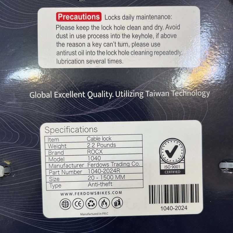 | سایر توضیحات | قفل دوچرخه راکس - به طول ۱.۵ متر و ضخامت ۱۵ میلیمتر می باشد. دارای مغزی ضد اسید و درب پوشش مغزی جهت امنیت بیشتر دو عدد کلید لیزری دارای کاور شلنگ پلاستیک مشکی شفاف مقاوت در برابر نور UV |