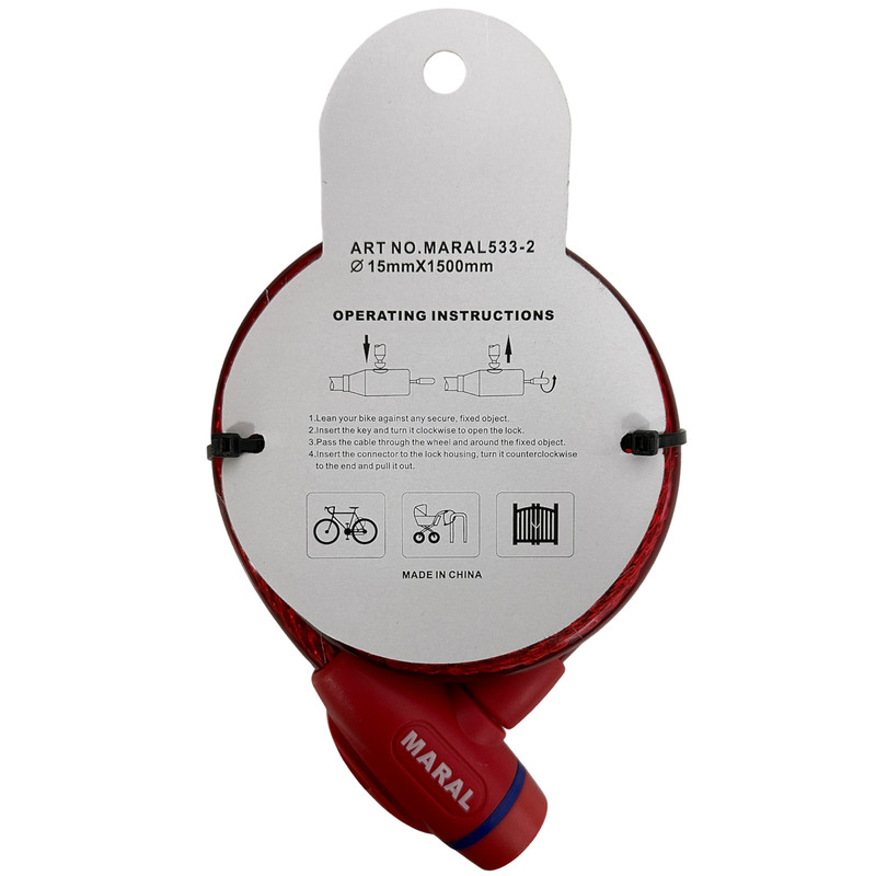 | سایر توضیحات | طول قفل 1.5 متر و قطر آن 15 میلیمتر میباشد / ابعاد بسته بندی: 18x12.5x4 سانتیمتر / دارای 2 عدد کلید / ساخت کشور چین / قفل دوچرخه کلیدی مارال 1500-15 |