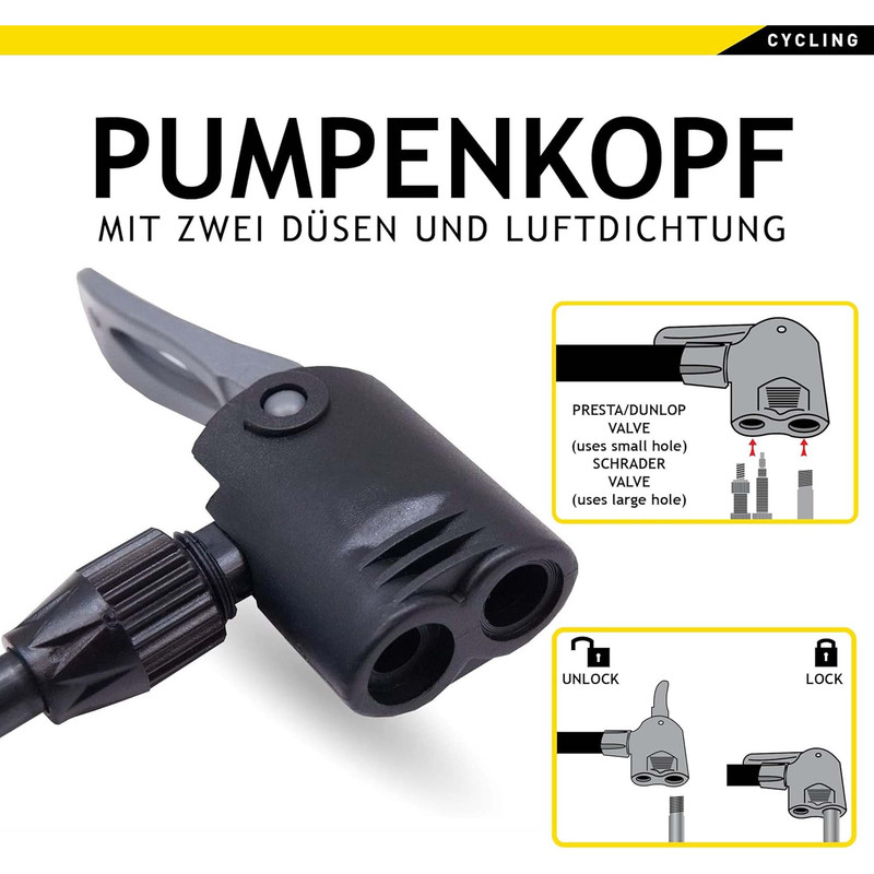 - سر دوکاره هوشمند (Presta + Schrader بدون آداپتور) + سوزن توپ و آداپتور