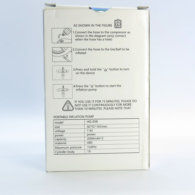 | سایر توضیحات | ولتاژ: 7.4 ولتباتری: دو عدد باتری داخلی با ظرفیت 2000 میلیآمپر (جمعاً 4000mAh)باد کردن تایر خودرو ،تایر موتور سیکلت و دوچرخه ، توپهای ورزشی (فوتبال، بسکتبال، والیبال و …) ،حلقه و وسایل بادی شنا ، بادکنکها |