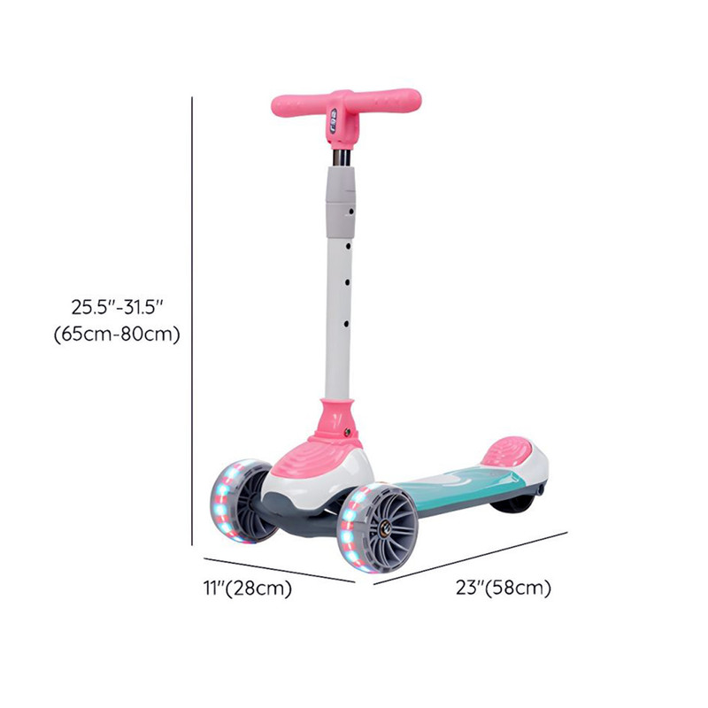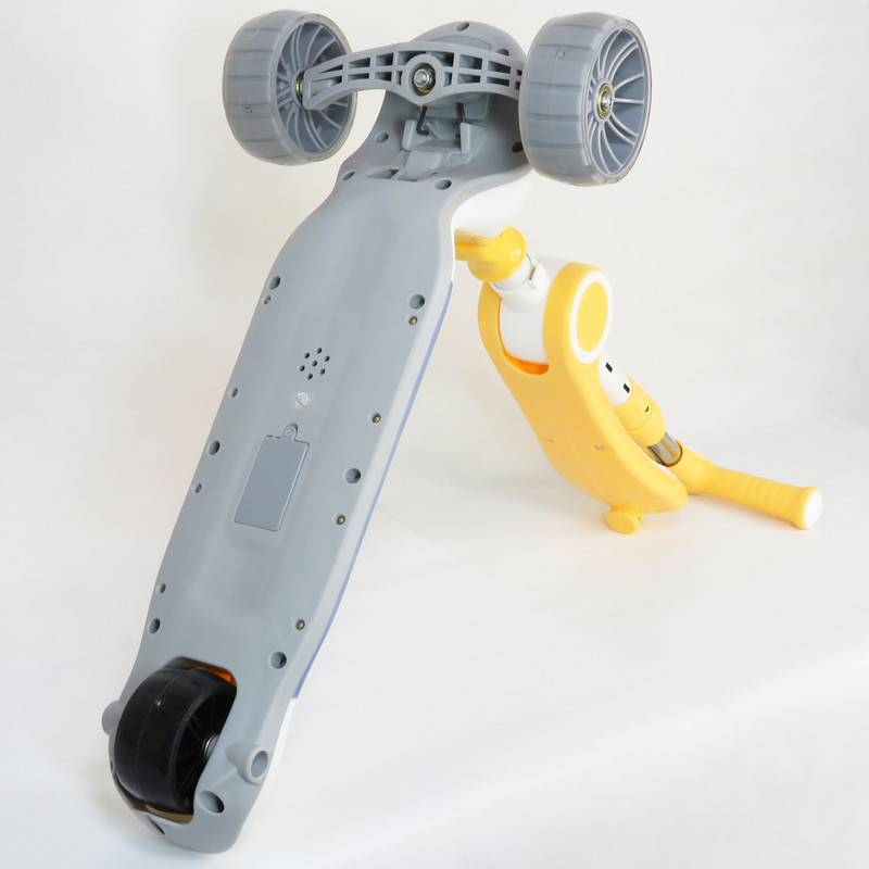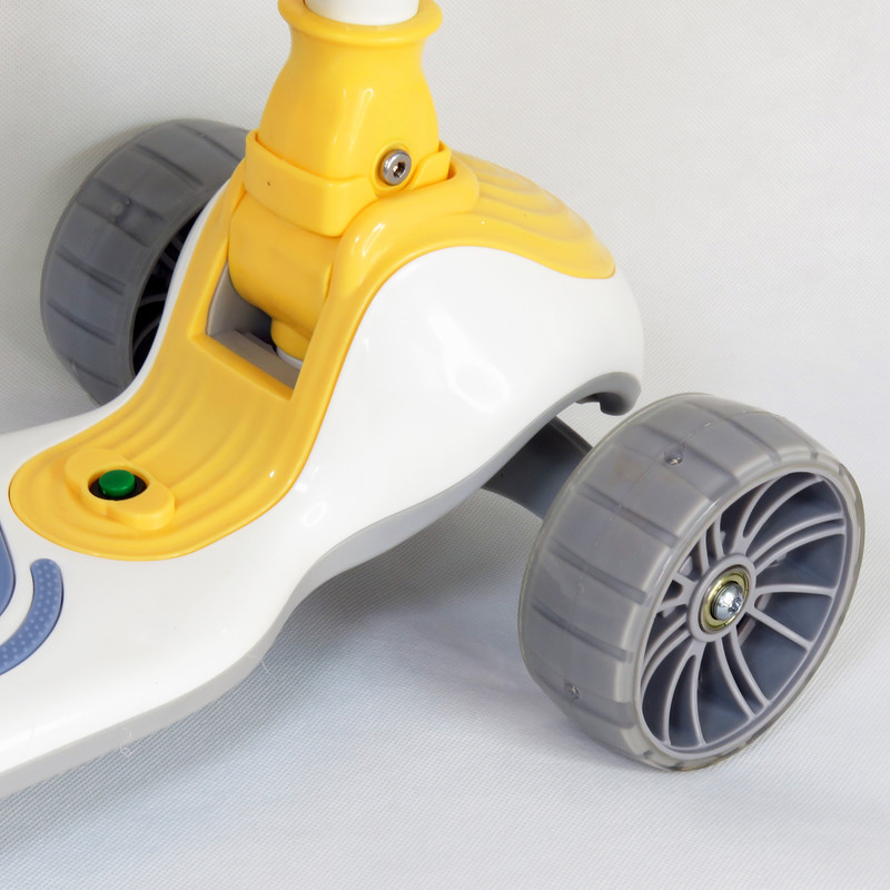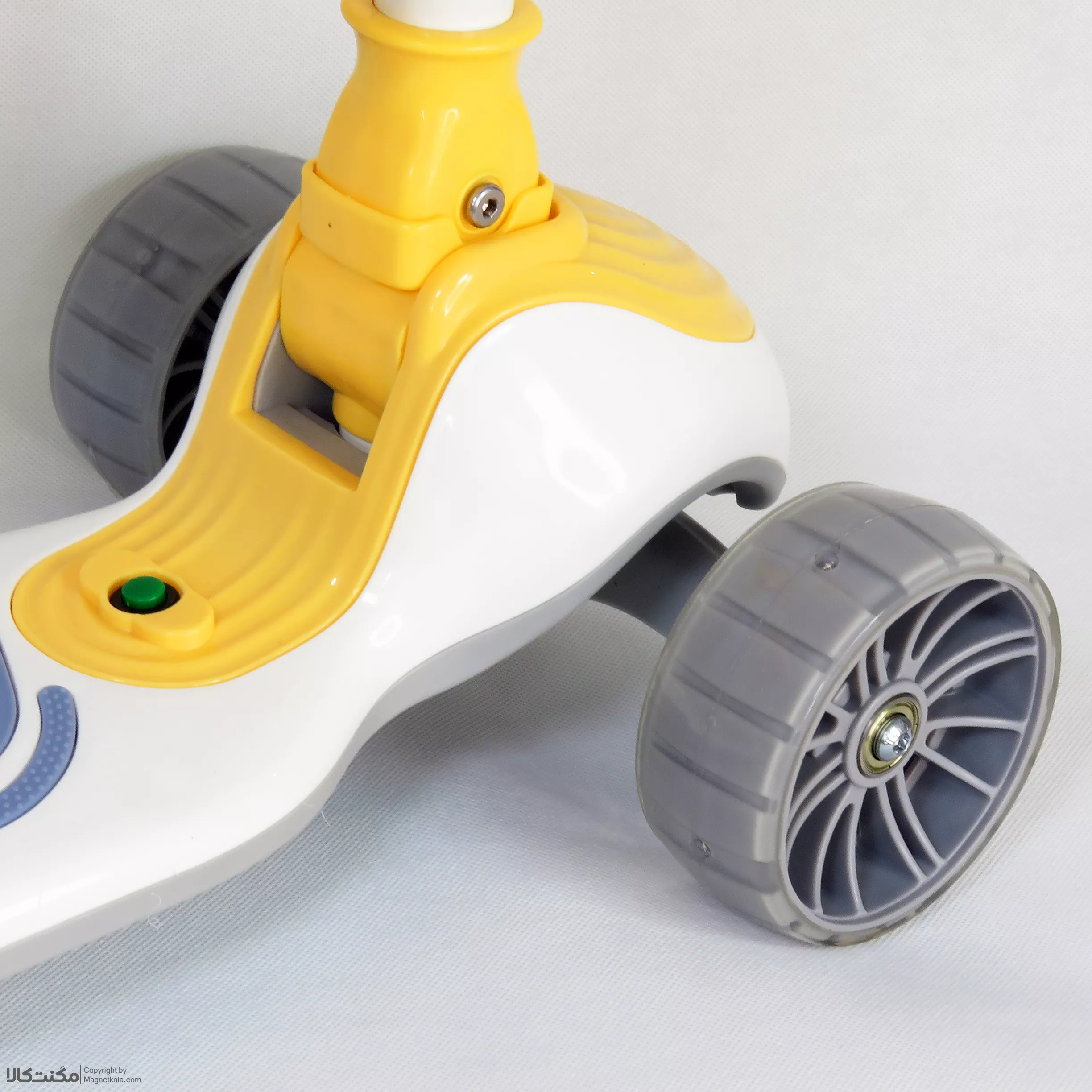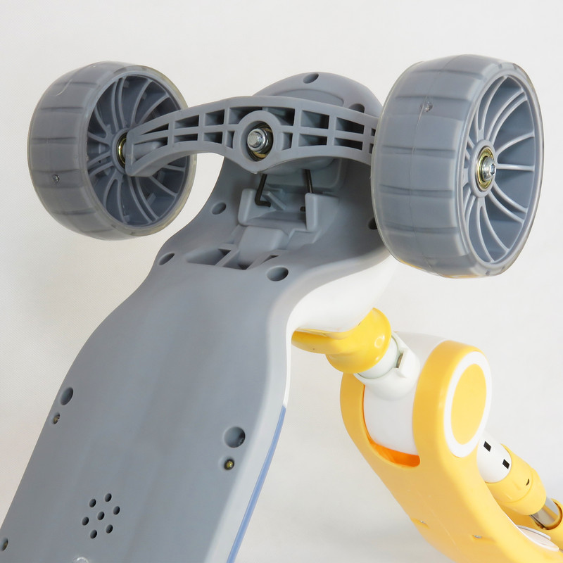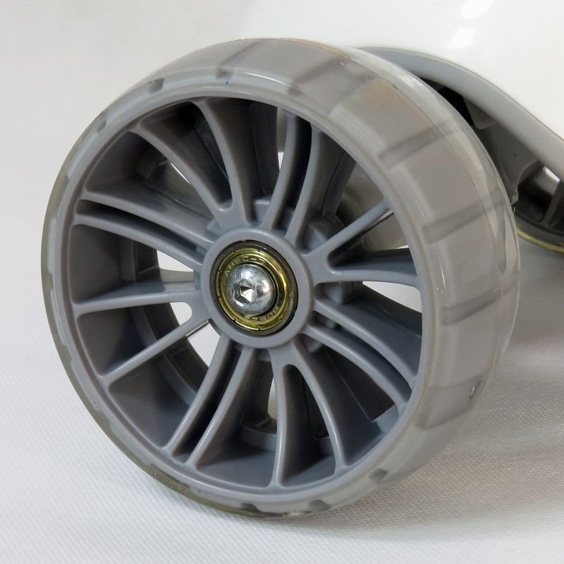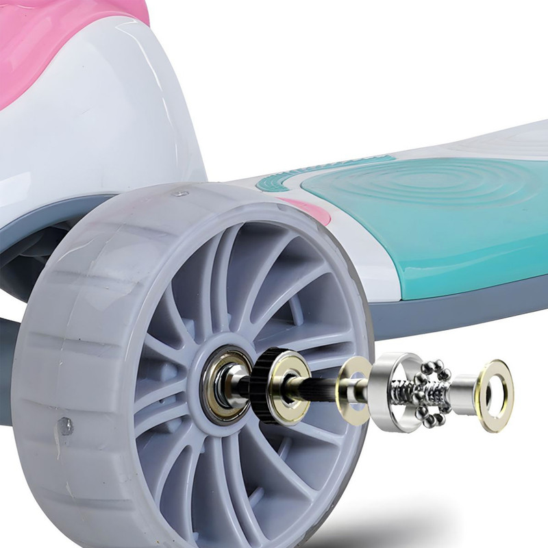 چرخهای ۱۲۰mm جلو و ۸۰mm عقب از PU با بلبرینگ ABEC-9، حرکت نرم و سریع دارند و LEDهای داخل چرخها بدون باتری (با چرخش روشن) در ۸ رنگ میدرخشد؛ شبها اسکوتر مثل یک فراری واقعی نور میپاشد! ترمز پایی عقب فولادی، توقف ایمن دارد.