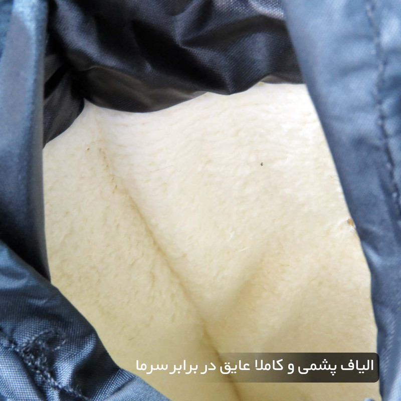 | جنس کالا | الیاف داخلی: پشمی / کرکی (Fleece) برای ایجاد گرمای بالا - لایه بیرونی: پارچه نانو ضدباد و ضدآب یا الیاف پلیاستر مقاوم - لبه و دوخت: نوار تقویت شده الیاف مصنوعی - کشها: جنس کشبافت سفت و مقاوم برای جلوگیری از نفوذ سرما |