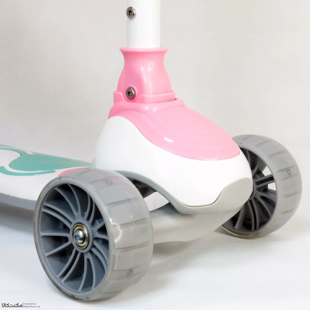 چرخ‌های ۱۲۰mm جلو و ۸۰mm عقب از PU با بلبرینگ ABEC-9، حرکت نرم و سریع دارند و LEDهای داخل چرخ‌ها بدون باتری (با چرخش روشن) در ۸ رنگ می‌درخشد؛ شب‌ها اسکوتر مثل یک فراری واقعی نور می‌پاشد! ترمز پایی عقب فولادی، توقف ایمن دارد.
